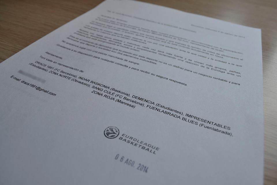 En representación de ocho grupos de aficionados de la Liga, Dracs 1991 han presentó el miércoles 6 de agosto en Barcelona la solicitud par que la Euroliga excluya al Maccabi Electra de Tel Aviv de la competición: «El deporte no debe ser el disfraz de un negocio», dice el texto firmado por Toni Valle. «No jugaremos con una pelota manchada de sangre», concluye el documento.
