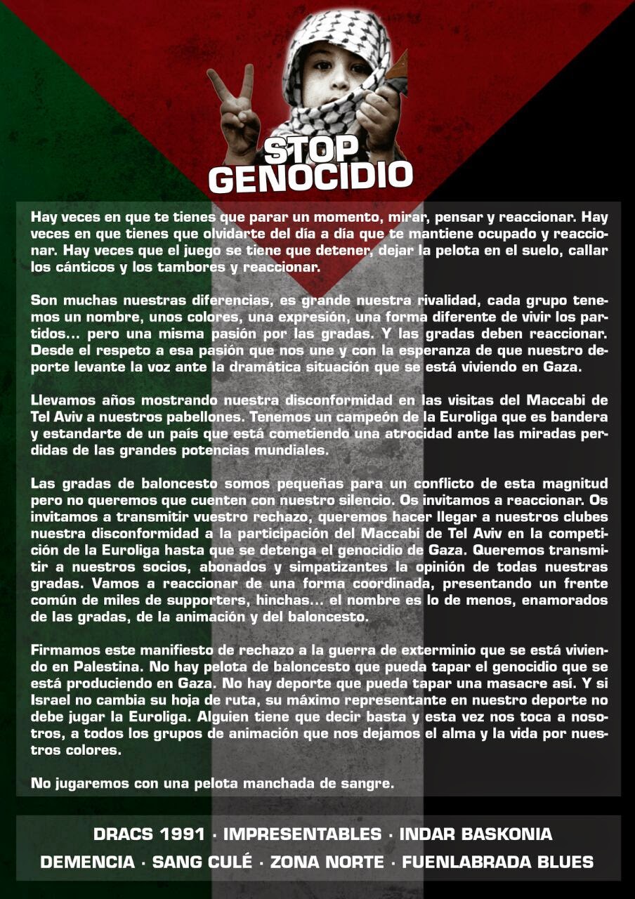 Ocho aficiones de distintos equipos de baloncesto de la ACB presentaron ante la Euroliga un comunicado bajo el lema No jugaremos con una pelota manchada de sangre en el que muestran su rechazo a las políticas israelíes contra el pueblo palestino y exigen la expulsión del Maccabi Tel Aviv de la Euroliga.