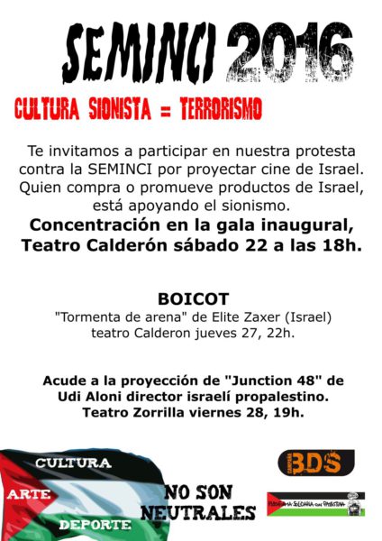 Artistas israelíes y el propio Israel, utilizan el arte y la cultura para lavar su imagen ante el mundo y difundir su versión totalmente falsa de la realidad diaria que allí se vive. “Sufat Chol” (Tormenta de arena), ha sido seleccionada por Israel para los Óscar, narrando una historia del pueblo beduino, que nada tiene que ver con la opresión y la violencia que sufren las mujeres beduinas, y todos los beduinos por parte de Israel. Una muestra más del lavado de imagen habitual del cine israelí. Lo que te pedimos, al igual que lo piden israelís comprometidos con una paz justa, es que la limpieza étnica, la segregación racial y religiosa, la colonización o la creación de muros de anexión y las masacres israelís tengan consecuencias para el estado de Israel, posicionándote así del lado de la justicia y la paz.