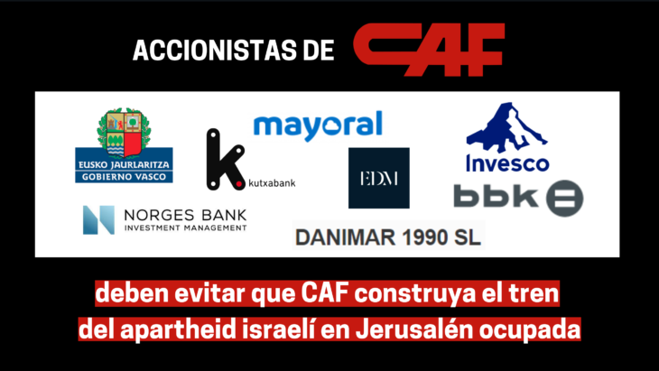 El sábado 11 de junio se celebra la junta anual de accionistas de CAF, una empresa vasca que está construyendo el Tren Ligero de Jerusalén (JLR), una línea de tranvía que da servicio a los asentamientos ilegales de Israel en Jerusalén y fomenta el régimen de apartheid y colonialismo de los colonos.