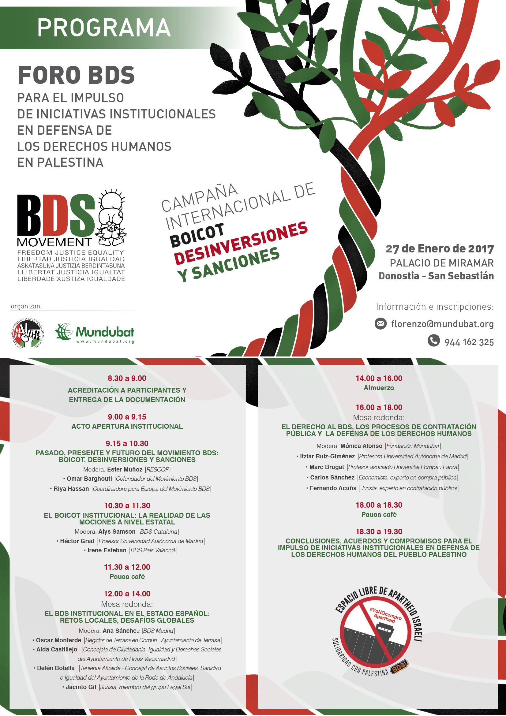 The BDS Forum to Promote Institutional Initiatives in Defence of Human Rights in Palestine shall be held from 8:30 on Friday 27 January 2017 at Miramar Palace, Donostia-San Sebastian.