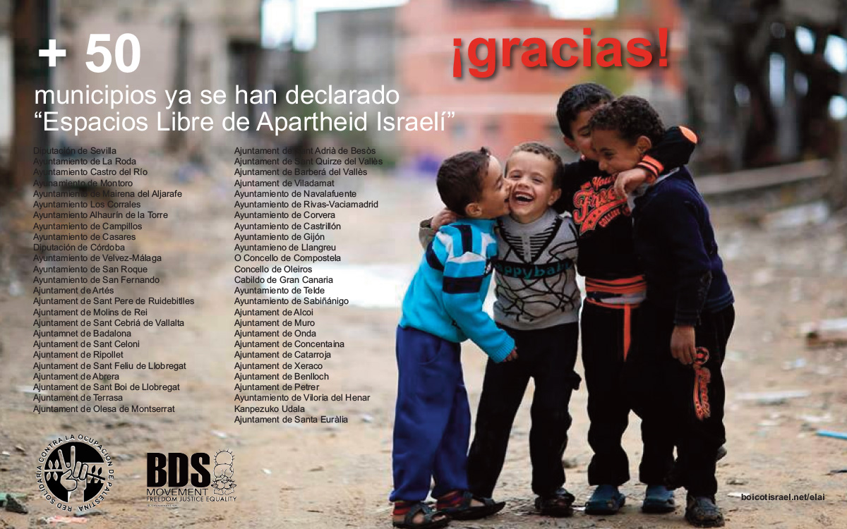 La solidaridad con el pueblo palestino no deja de crecer en el Estado español. La iniciativa de creación de Espacios Libres de Apartheid Israelí (ELAI), que responde a la llamada internacional lanzada por sociedad palestina para poner en marcha el BDS para que el Estado de Israel cumpla con el derecho internacional y respete los Derechos Humanos del pueblo palestino, ha superado ya las 50 administraciones públicas declaradas ELAI y/o adheridas a la campaña BDS, siendo el Estado del mundo en el que más instituciones públicas se suman a la campaña.