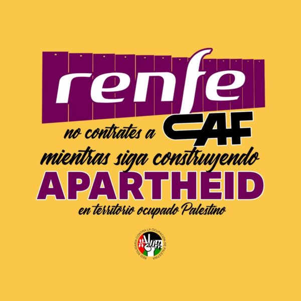 Ayúdanos y escribe a la Dirección General de Renfe para que no se contrate a CAF ni a ninguna otra empresa cómplice con expolio de tierras palestinas mientras construyan apartheid en territorio ocupado Palestino.