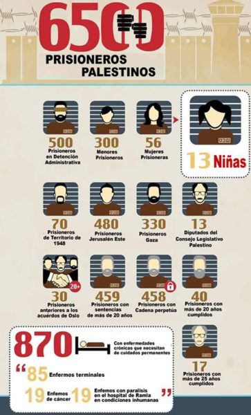 El número de personas palestinas encarceladas a fecha de hoy es de 7200, un número que tiende a aumentar al incrementarse las redadas diarias en todo el territorio palestino; 750 de ellas están bajo detención administrativa, una forma de tener meses y años privados de libertad a los palestinos sin juicio, sin saber la acusación y sin tener derecho de abogado; 500 condenadas a cadena perpetua, hasta la muerte, con 30 personas que llevan más de 25 años en la carcel; 73 mujeres, 18 de ellas menores de edad; 1700 presos enfermos, 23 de ellos terminales; 6 diputados; 31 periodistas y medio millar de menores de 18 años. La prisión es por tanto un elemento más de la política de limpieza étnica del estado de Israel.