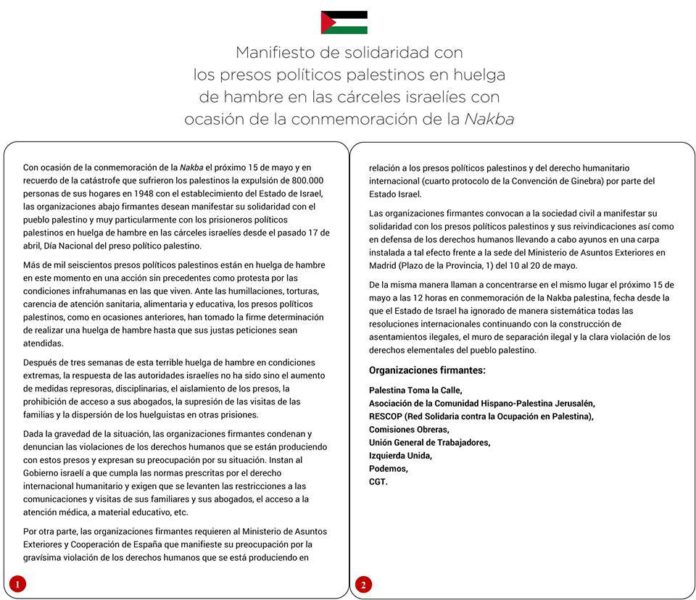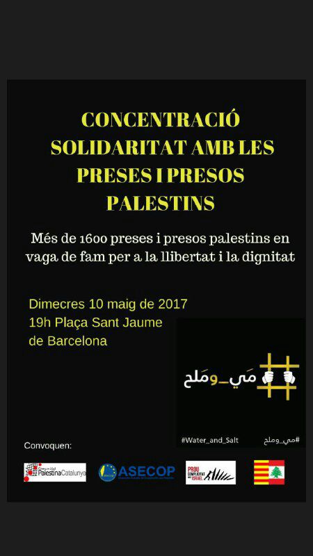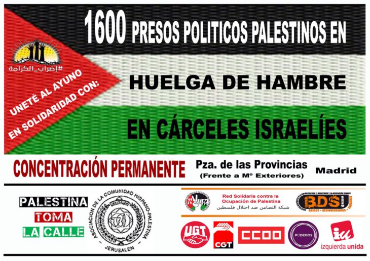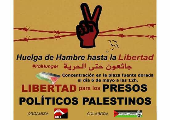 Ante la situación crítica de l@s prisioner@s palestin@s y el rechazo israeli a negociar sus justas y básicas reivindicaciones , esta es una llamada a todas las personas de conciencia para que se movilicen en las plazas publicas el jueves 25 de mayo realizando una huelga de hambre , para demostrar su solidaridad con la heroica resistencia de los prisioneros políticos palestinos en huelga de hambre desde el 17 de abril y denunciar las torturas, denegación de asistencia medica si no dejan la huelga y brutal represión de Israel , dentro y fuera de las cárceles.