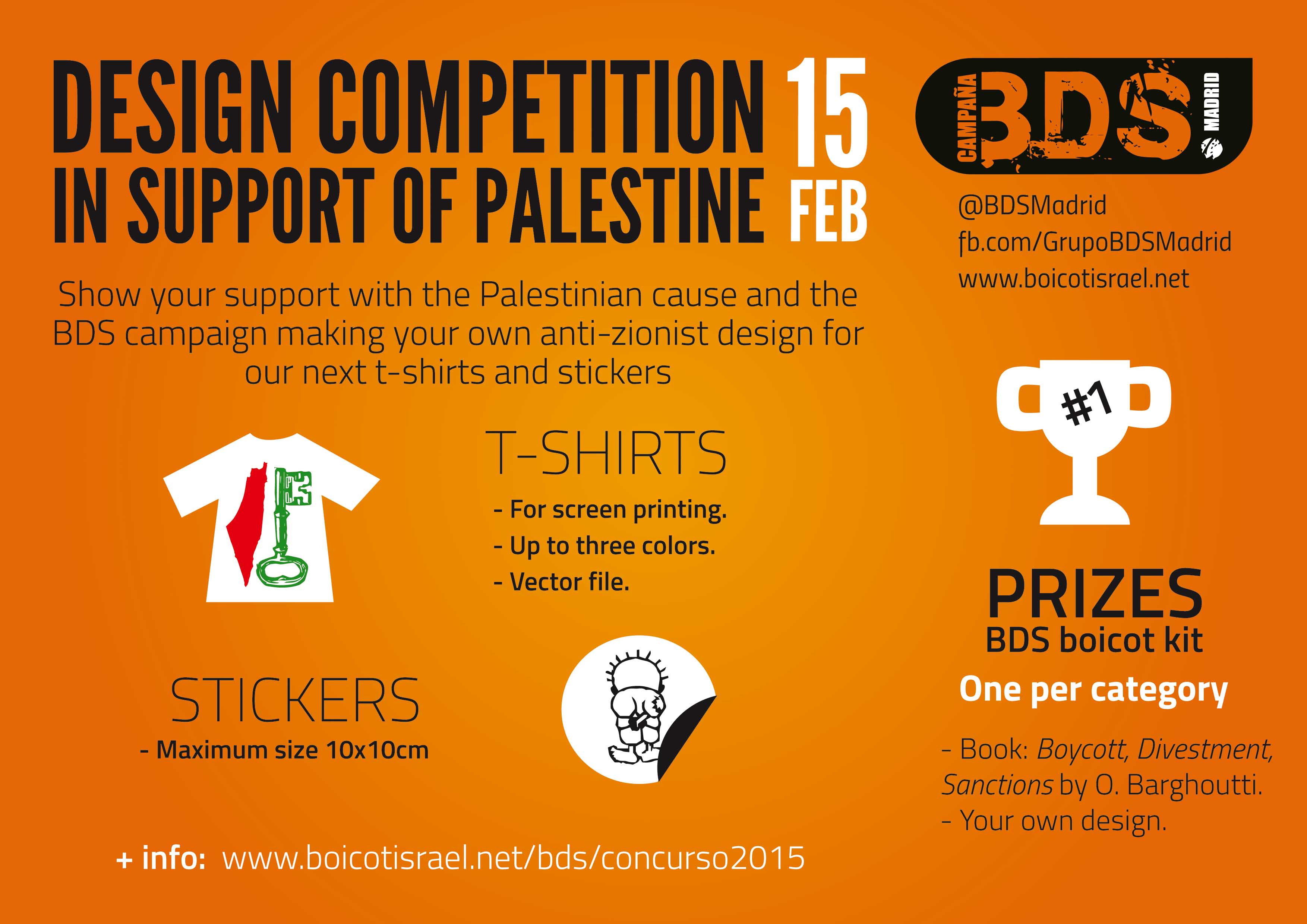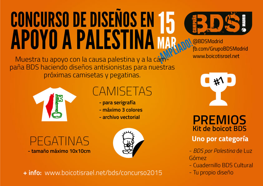 El 10 de diciembre de 2015, con motivo del Día Internacional de los Derechos Humanos, lanzamos este concurso de diseños en apoyo al pueblo palestino. Hasta el 15 de febrero 15 de marzo podréis enviar vuestros diseños, y con los ganadores haremos camisetas y pegatinas.