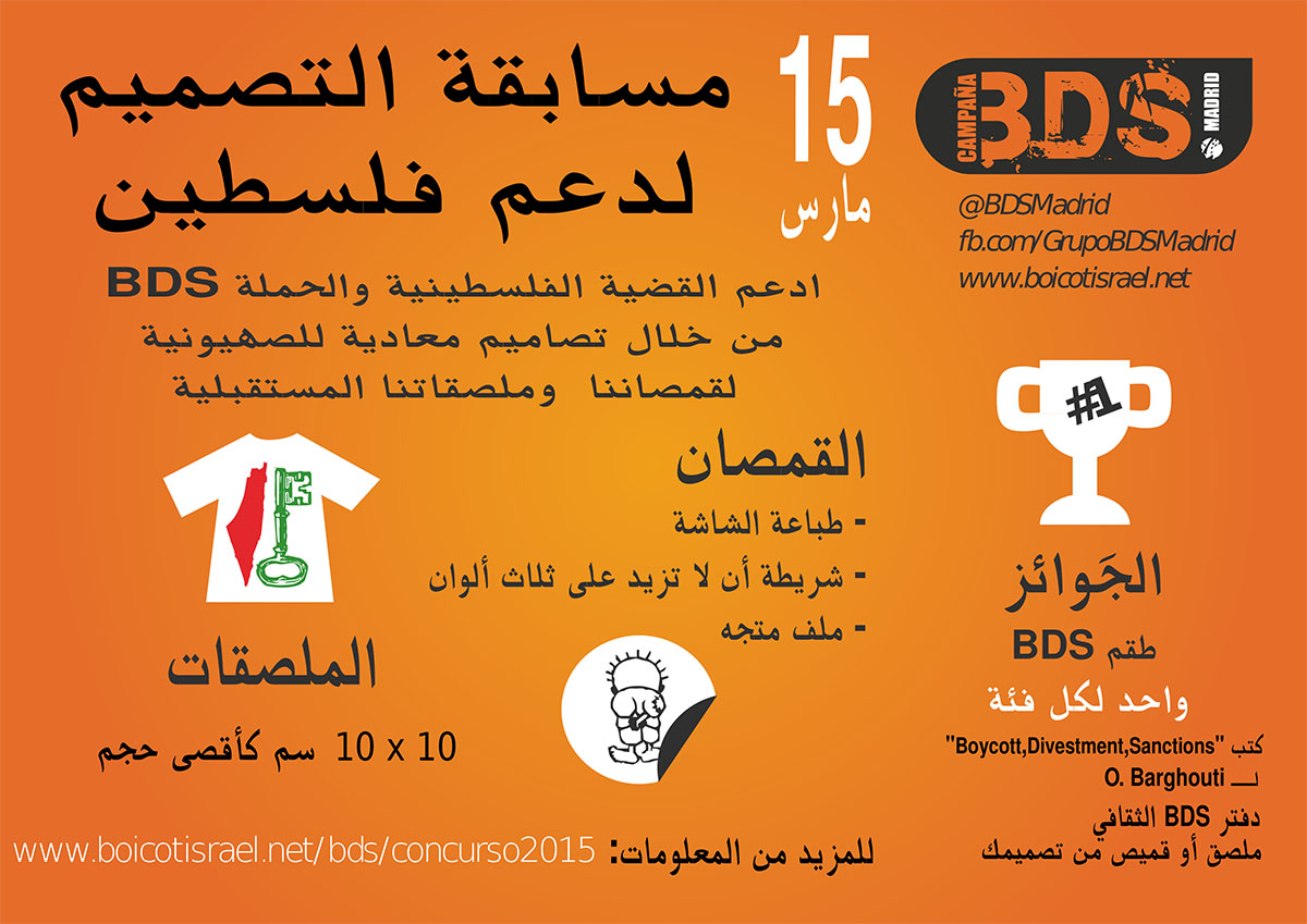 • You should submit the designs to boicotisraelbds@gmail.com email writing in the subject «design contest» and adding name, location and telephone number in the message body.