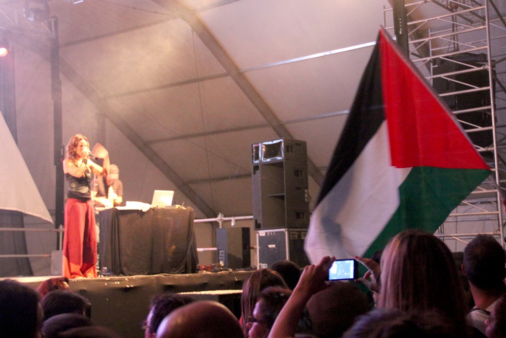 Actuación de Chambao con protestas entre el público, que ondearon banderas y carteles de boicot a Israel (Imagen Ilya U. Topper/M’Sur)