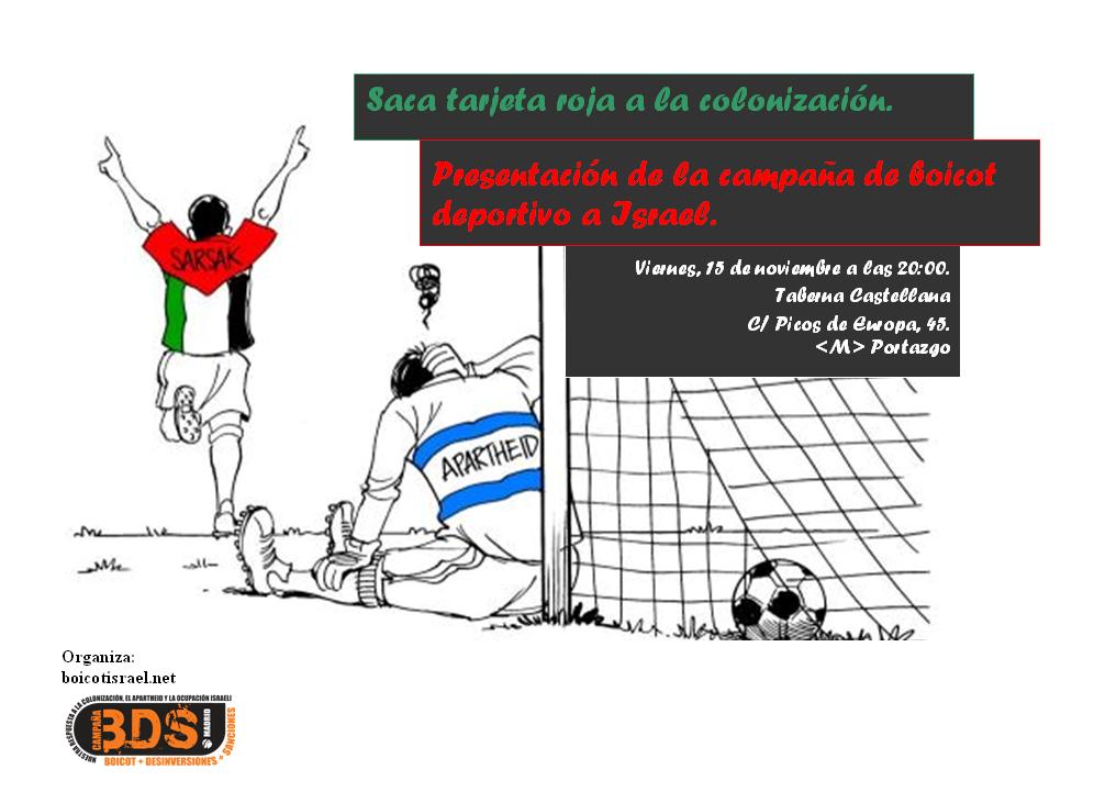 El viernes 15 de noviembre a las 20h, presentamos la campaña de boicot deportivo en la Taberna Castellana (C/ Picos de Europa 45, Portazgo): ¡SACA LA TARJETA ROJA A LA COLONIZACIÓN!