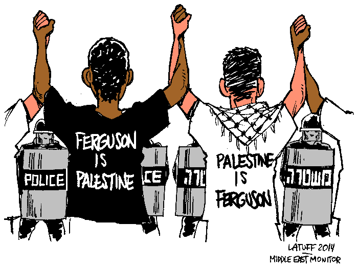 En Ferguson la gente le está llamando a esto ‘su intifada’. El mismo gas lacrimógeno usado contra los palestinos que luchan por la libertad está siendo utilizado contra las personas que luchan por sus derechos en EEUU y en todas partes. Una fuerza policial predominantemente blanca ha levantado checkpoints, bloqueos de carreteras y distintos tipos de muros en las comunidades negras en toda el área de St. Louis y más allá. El estudiante de Derecho Dayo Olopade escribe que la situación en Ferguson es en esencia de ocupación: «Cuando los funcionarios tienen derecho a controlar tus movimientos, acciones y destino, no hay otra palabra (…) Cuando encima de eso, los ocupantes no se te parecen en nada y no son parte de tu comunidad, es mucho peor». La gente está hacienda las conexiones entre la violencia israelí contra los palestinos y el fenómeno global del control policial militarizado en las comunidades de color.