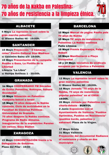 Desde los distintos grupos de solidaridad con Palestina del Estado español, agrupados en la Red Solidaria Contra la Ocupación de Palestina (RESCOP), hemos organizado más de una treintena de actos en conmemoración de la Nakba palestina. Visibilizar el régimen de violencia, discriminación y apartheid que Israel impone al pueblo palestino es un elemento crucial para ponerle fin a esta situación de injusticia que dura ya demasiado tiempo. Es por ello que desde la RESCOP hacemos un llamamiento para que este 15 de mayo no nos quedemos en casa. Hay múltiples maneras de denunciar lo que está pasando en Palestina y os necesitamos a todas para romper este silencio y ponerle fin a esta Nakba continua.