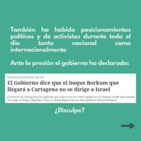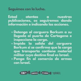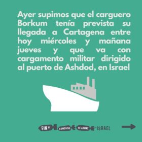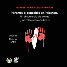 Sabemos que está en sus manos. España puede, y debe, ser un ejemplo. Desde Palestina y desde todo el estado español la sociedad civil lo exige: llevamos meses llenando las calles, una y otra vez, pidiendo a gritos el fin del comercio de armas con Israel. No se puede hablar de derechos humanos, mientras se permite que barcos con armas a Israel paren en puertos del Estado español y mientras se sigue comprando armas a Israel, lo que implica financiar el genocidio contra el pueblo palestino.