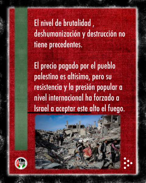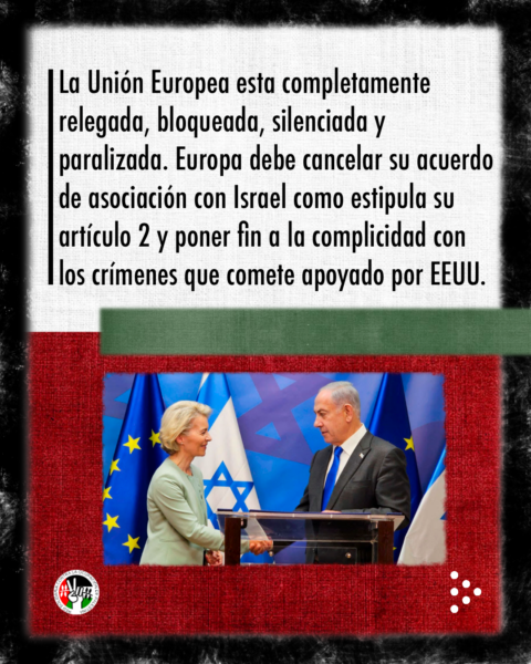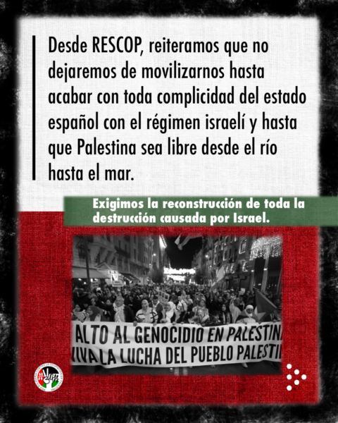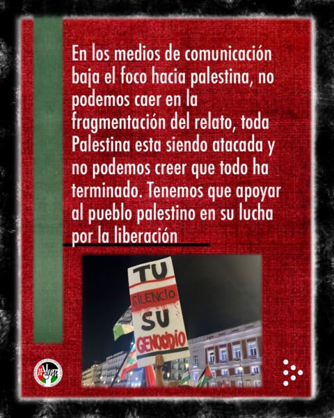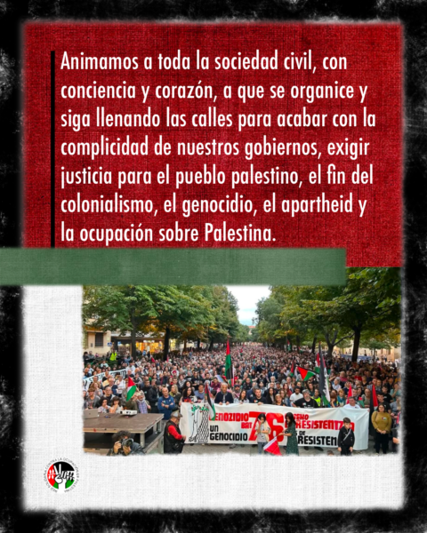 - Que el gobierno del estado español asegure que ni este acero ni otra carga militar o de doble uso llegue a Israel donde puede contribuir al genocidio, ocupación illegal, y apartheid contra el pueblo palestino