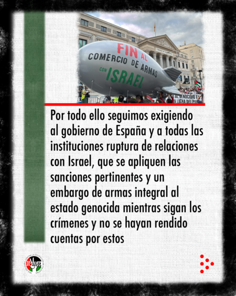 - Que el gobierno del estado español decrete un embargo integral de armas a Israel