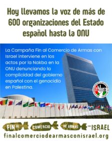 Destaca la vasta movilización en España: «Más de 19 meses, cientos de miles han llenado las calles en más de 100 ciudades de España exigiendo el fin del comercio de armas y la cooperación militar con Israel».