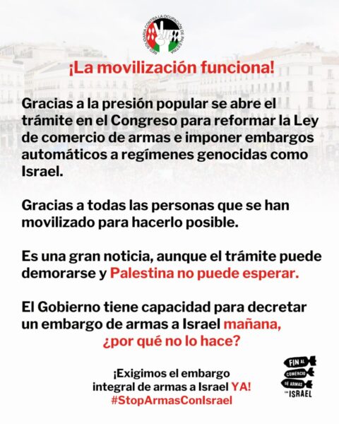 Hoy hemos dado un gran paso, pero la lucha continúa. Seguiremos empujando para que la Ley salga adelante. ¡Y seguimos exigiendo al Gobierno que decrete YA un embargo integral de armas a Israel!